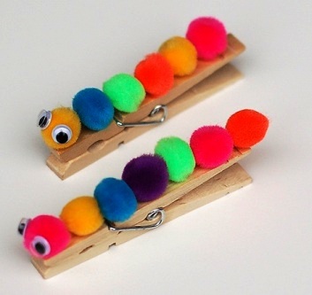 Обычную деревянную прищепку можно превратить с ребенком в веселую цветную гусеницу с помощью маленьких помпонов.