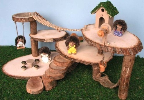 Из дерева и разнообразных природных материалов- таких как деревянные срезы и распилы и куски толстых веток можно делать невероятно красивые игровые домики для кукол. Это скорее поделка для пап или мальчиков школьного возраста, которую можно сделать на даче, но с получившимися домиками будут с удовольствием играть малыши и дошкольники.