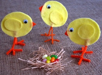 Простая поделка цыплят, которую можно сделать из ткани и синельной проволоки. Вместо ткани можно использовать и картон.