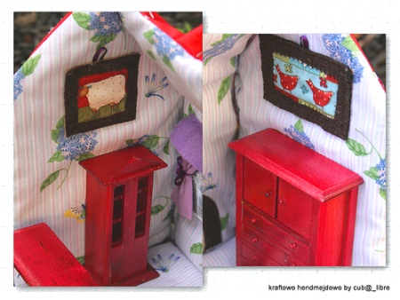 ![]() Еще один раскладной кукольный домик из ткани для ролевых игр, хранения и переноски игрушек. В домик можно поставить маленькую игрушечную мебель. Тут можно подробно почитать как сделать домик из ткани Посмотреть еще фотографии [/b] ![]() Расстегнутая стенка домика превращается в лужайку с тропинкой и прудом. ![]() ![]() На внутренних стенках пришиты маленькие картины. ![]() Занавески, коврик и камин. ![]() А так домик выглядит снаружи. Нет комментариев. Ваш будет первым! |